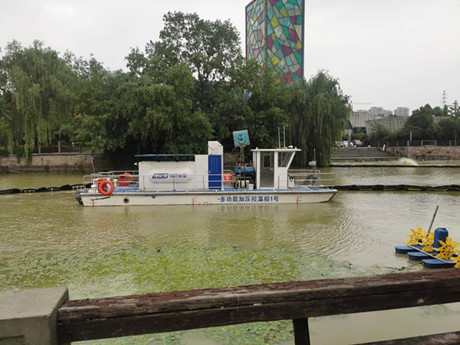 公司研發的加壓控藻船,以玻璃鋼船體為平臺,配置藍藻打撈、壓力控藻和曝氣裝置...